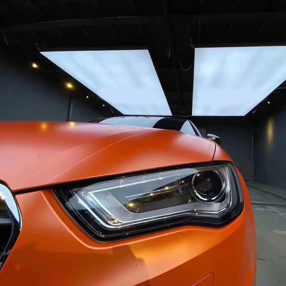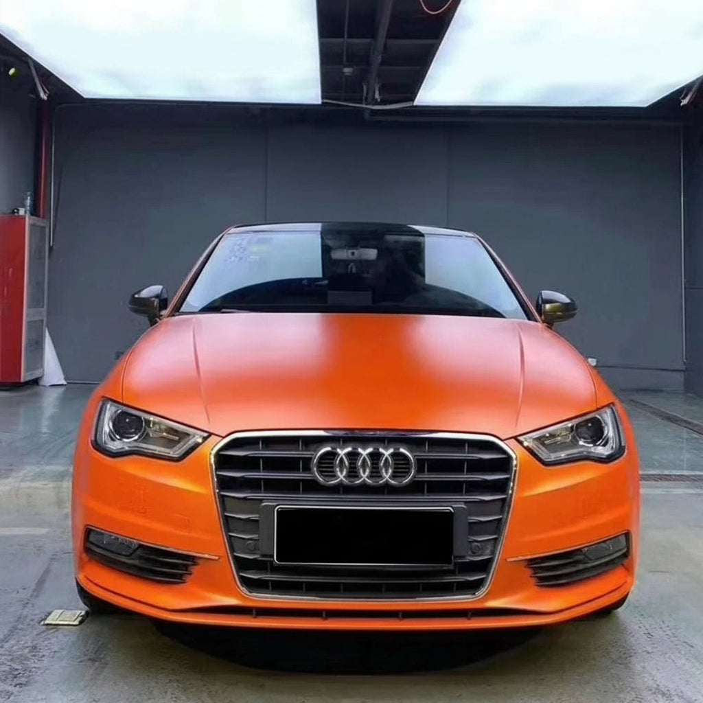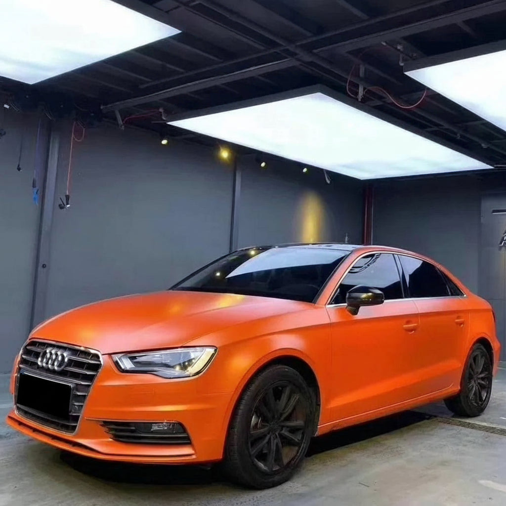 Vinilo satinado metálico en color naranja, perfecto para vinilar el coche completo o detalles. Ofrece una textura suave, acabado profesional y gran flexibilidad para adaptarse a cualquier forma.